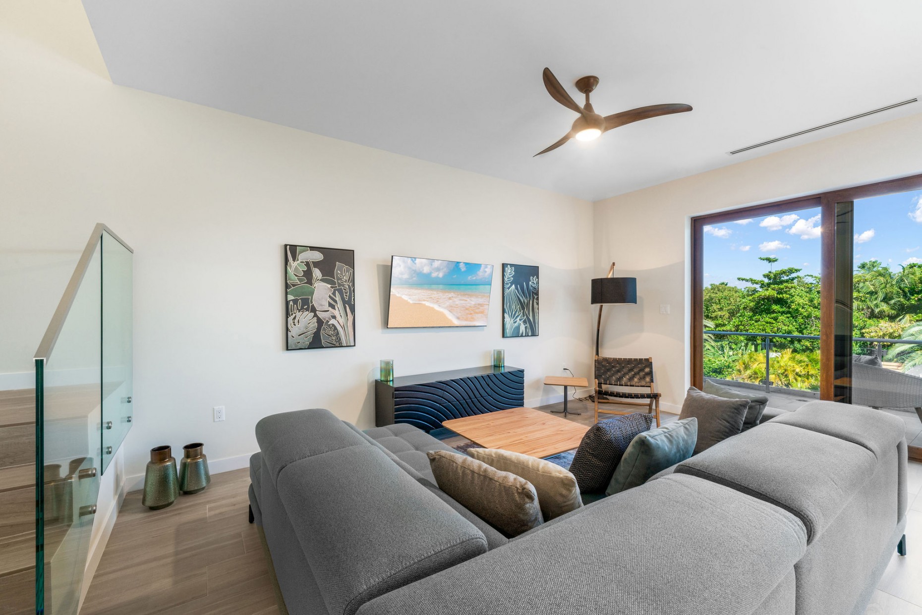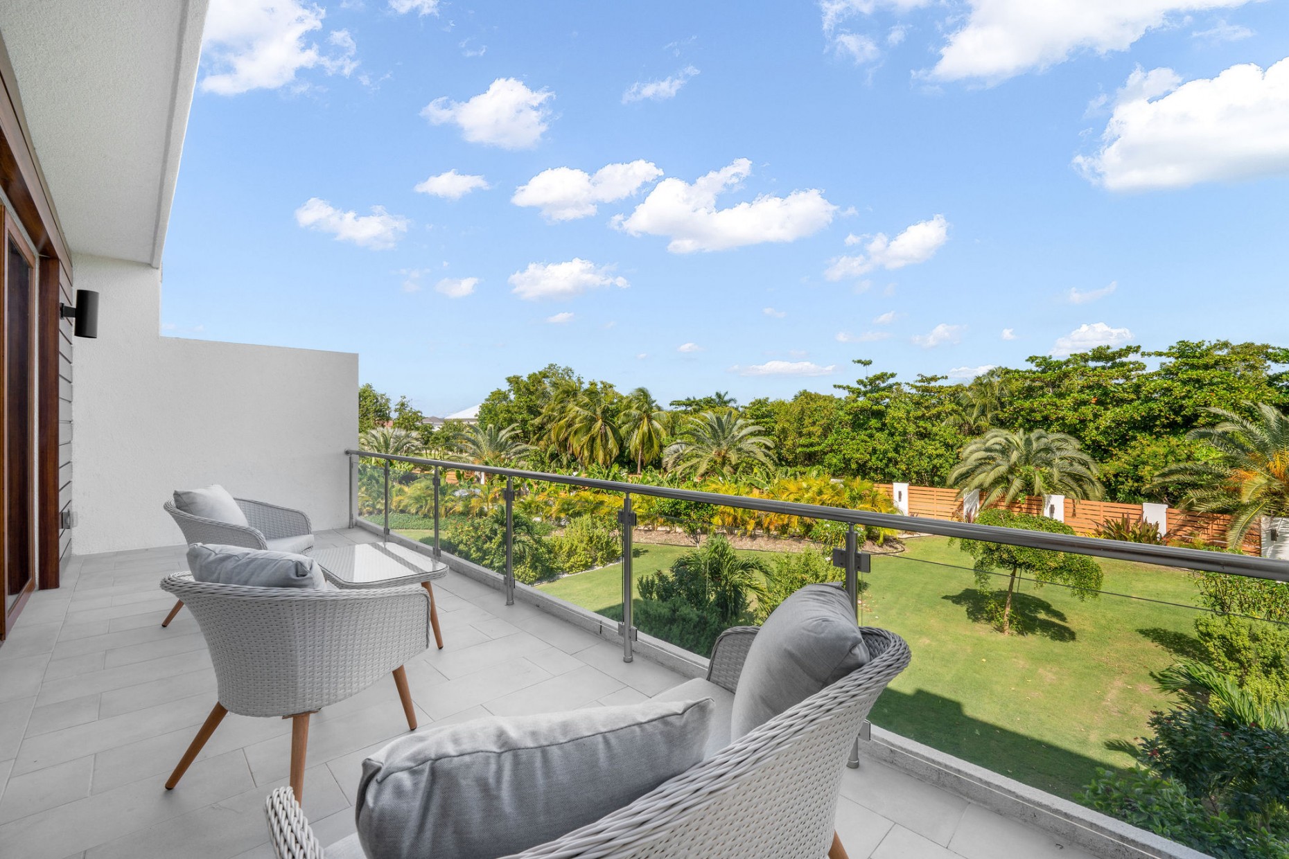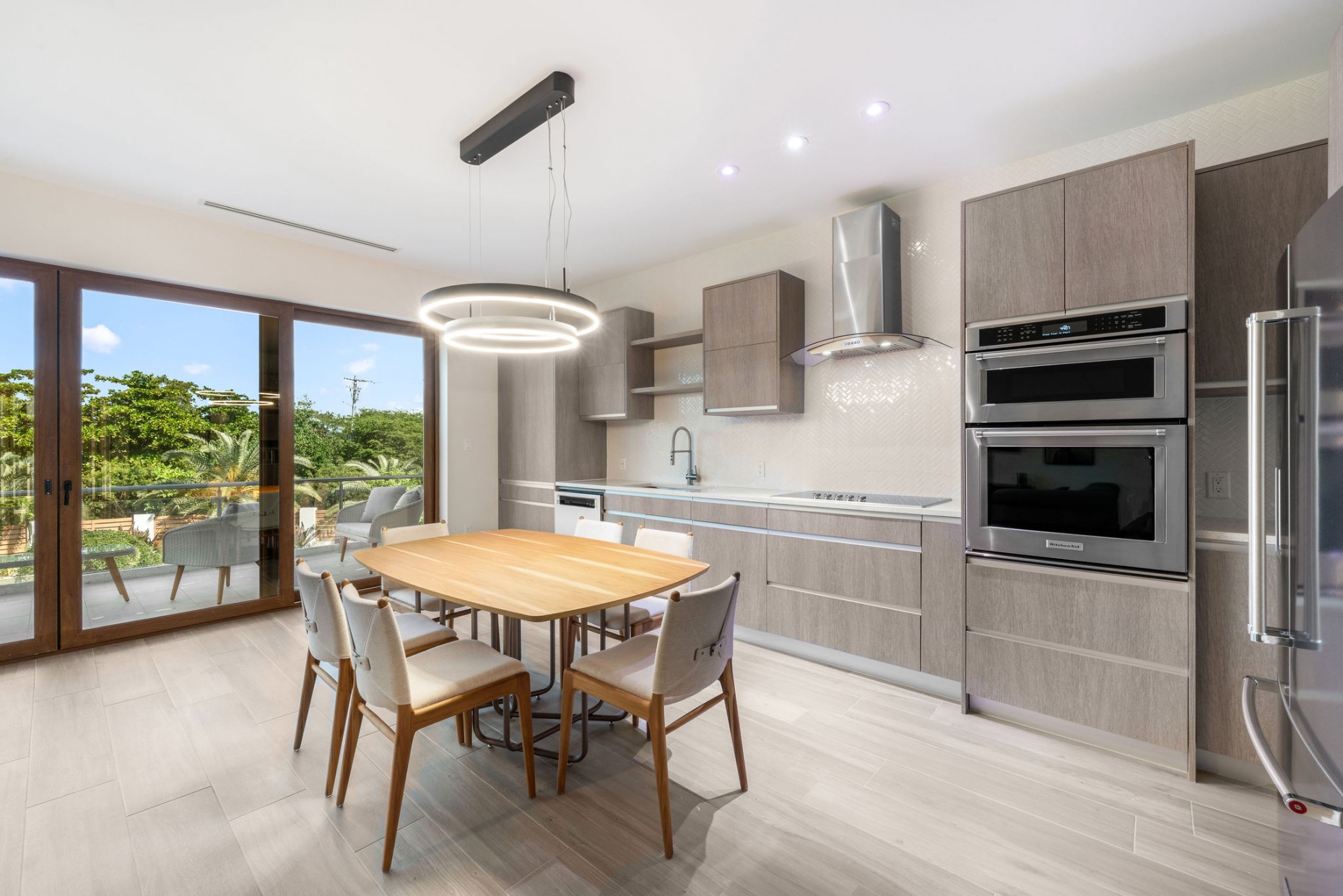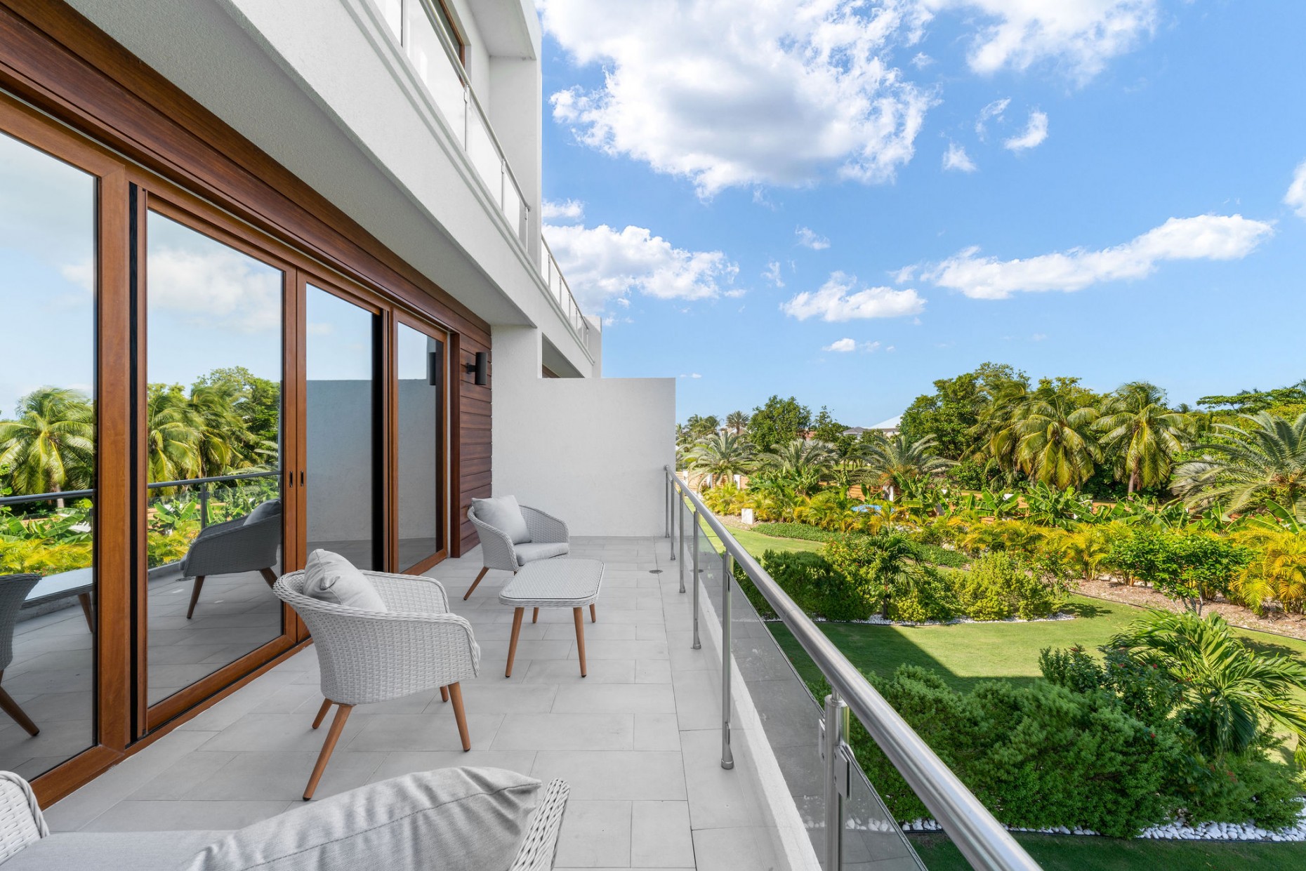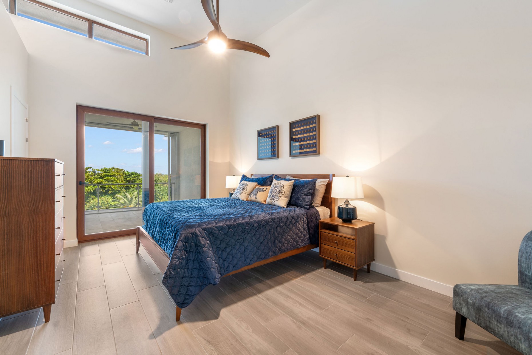 From your entry gate and courtyard, leading up stairs to the front door which opens onto the hallway and 2nd and 3rd bedrooms, one with an en-suite bathroom and walk-in closet, the other with a shared guest bathroom. A deep utility room houses the front loading washer and dryer. The comfortable living room, dining and kitchen area boast tropical views and catch the breeze from the expansive terrace - the double sliders have built-in mosquito screens if required. With a KitchenAid appliance package, European style cabinets and Ceasarstone countertops thie kitchen is sleek and stylish.