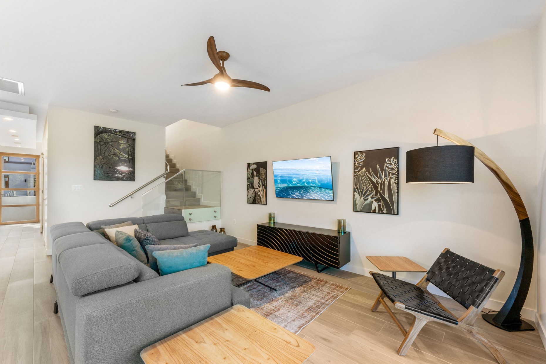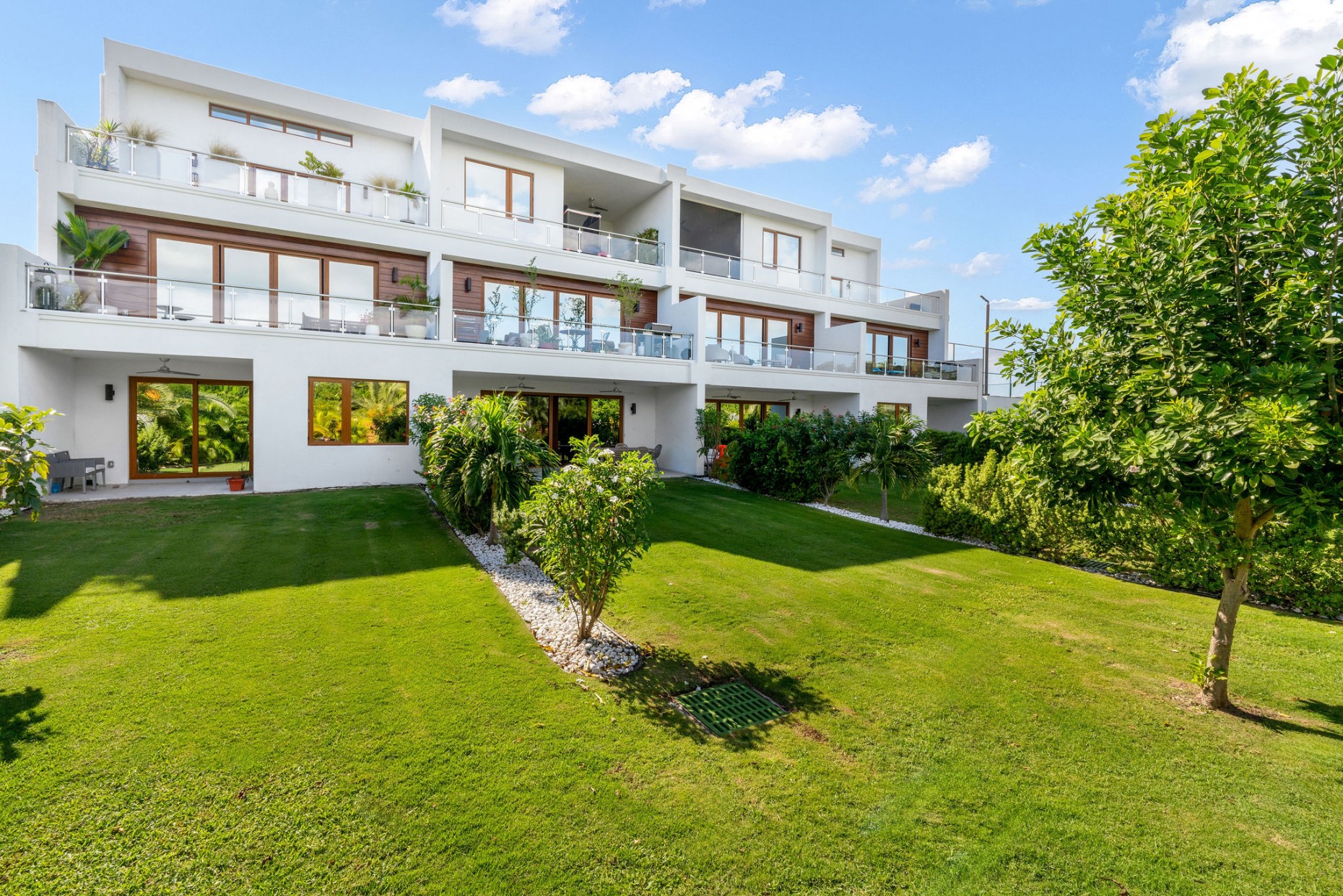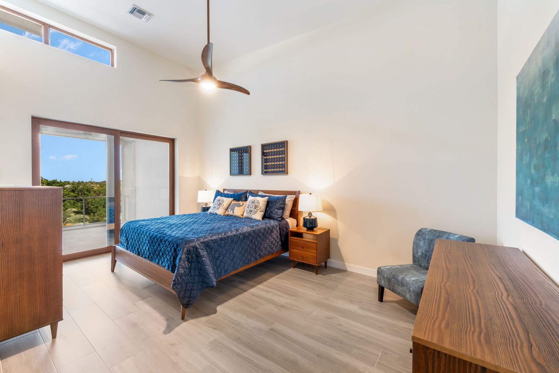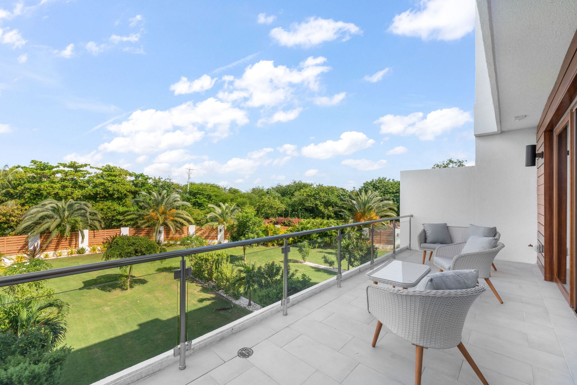 From your entry gate and courtyard, leading up stairs to the front door which opens onto the hallway and 2nd and 3rd bedrooms, one with an en-suite bathroom and walk-in closet, the other with a shared guest bathroom. A deep utility room houses the front loading washer and dryer. The comfortable living room, dining and kitchen area boast tropical views and catch the breeze from the expansive terrace - the double sliders have built-in mosquito screens if required. With a KitchenAid appliance package, European style cabinets and Ceasarstone countertops thie kitchen is sleek and stylish.