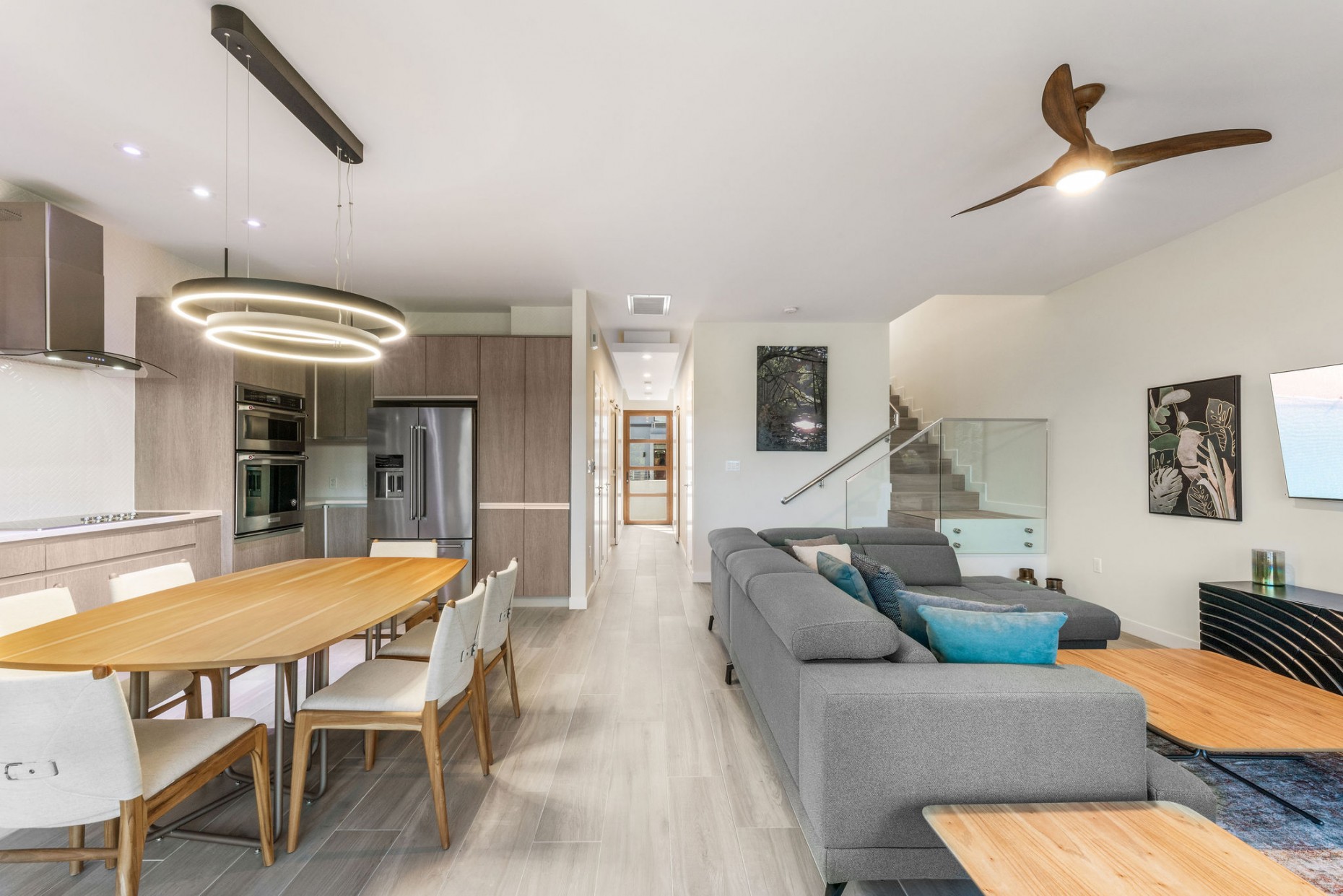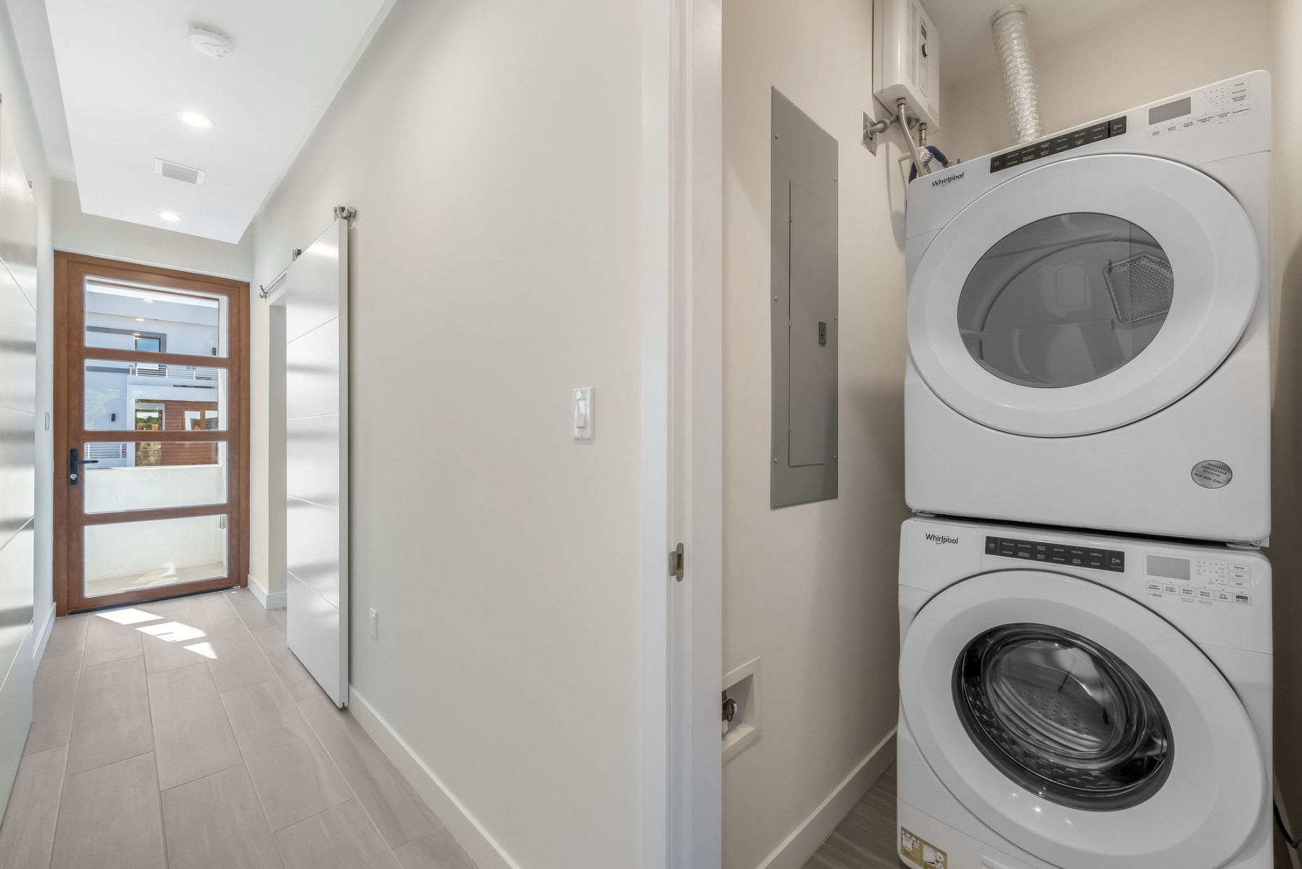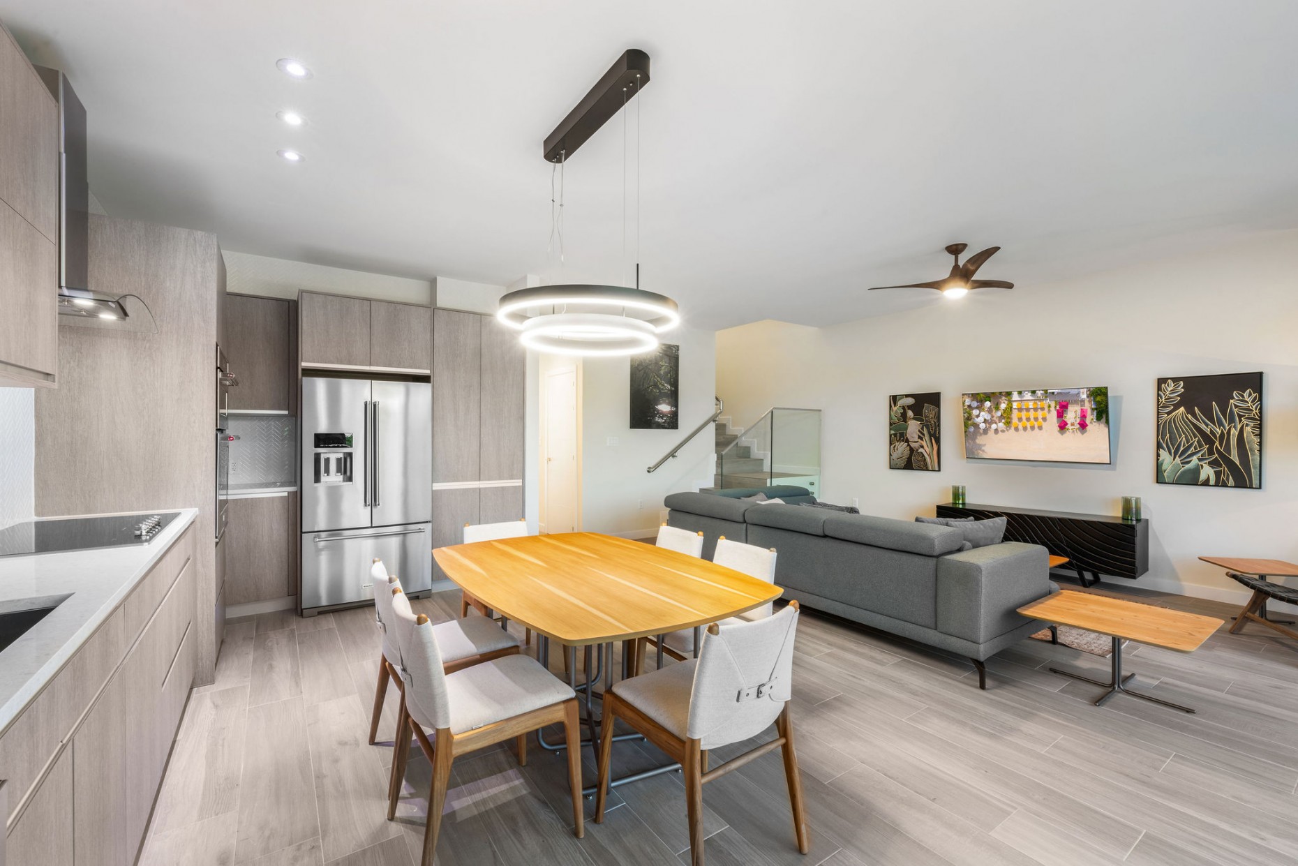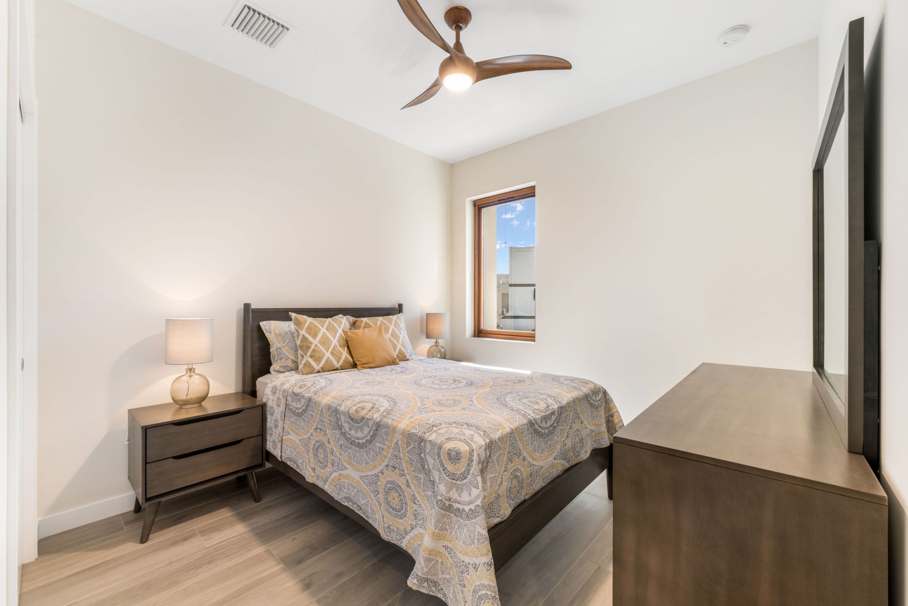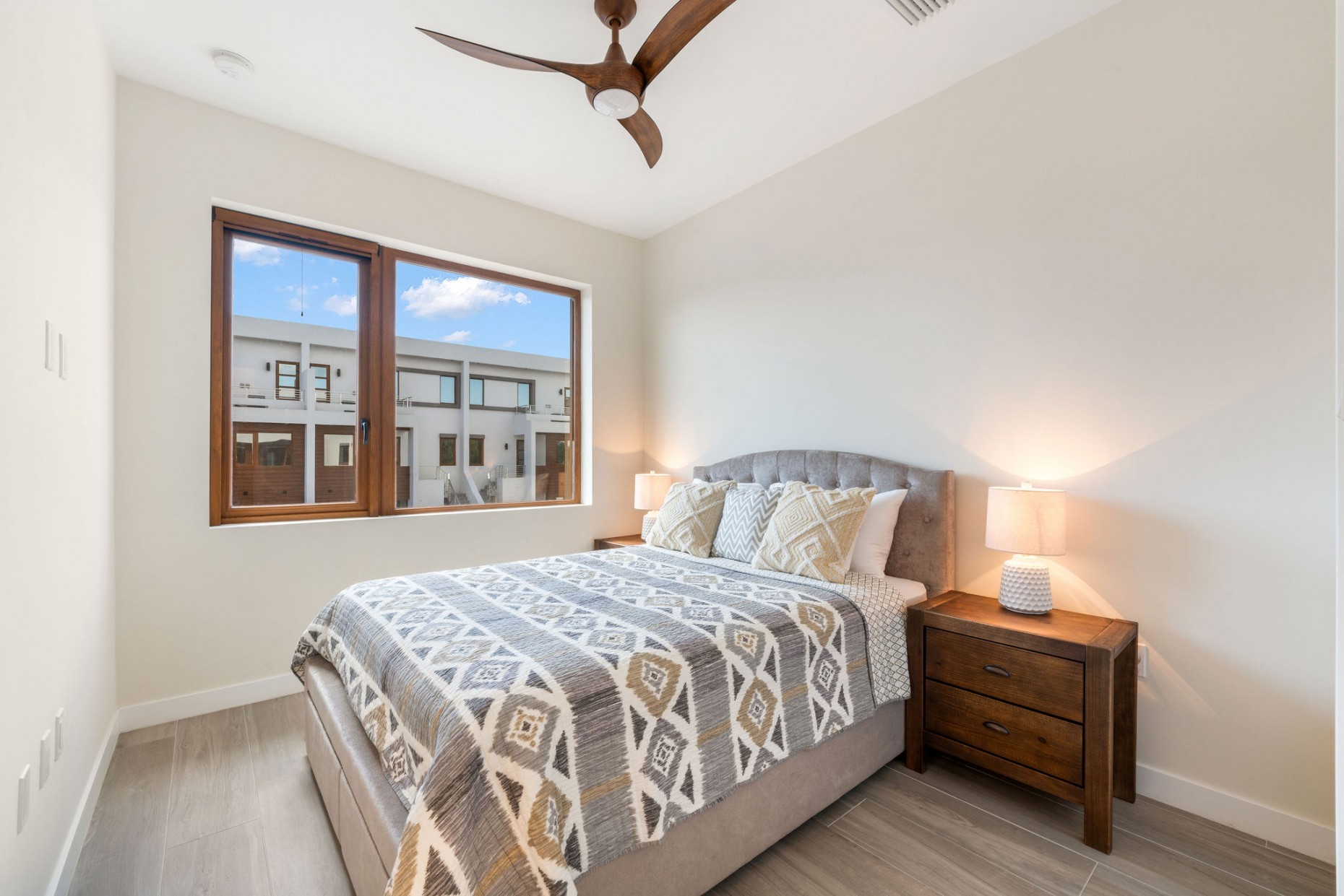 From your entry gate and courtyard, leading up stairs to the front door which opens onto the hallway and 2nd and 3rd bedrooms, one with an en-suite bathroom and walk-in closet, the other with a shared guest bathroom. A deep utility room houses the front loading washer and dryer. The comfortable living room, dining and kitchen area boast tropical views and catch the breeze from the expansive terrace - the double sliders have built-in mosquito screens if required. With a KitchenAid appliance package, European style cabinets and Ceasarstone countertops thie kitchen is sleek and stylish.