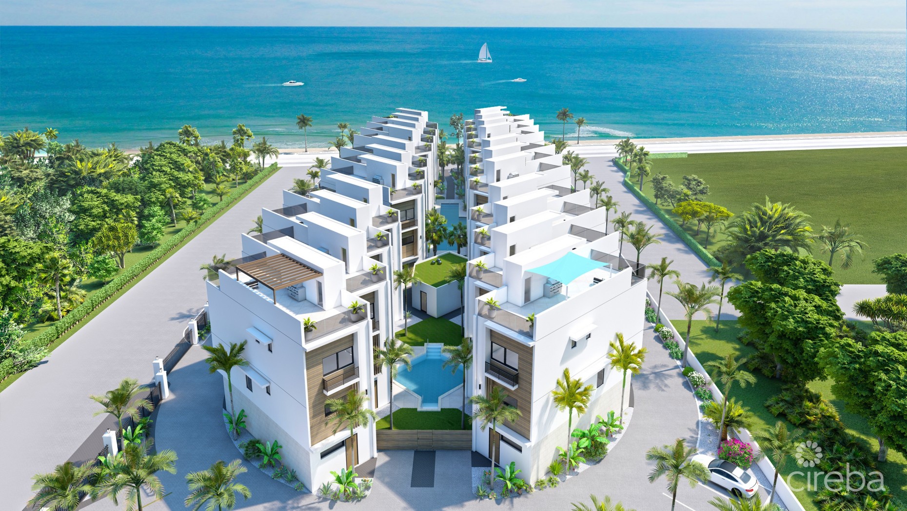 Q Luxury Townhomes presents an opportunity to become part of an exclusive gated community delivering sophistication to the South Sound area. Q Luxury Townhomes have been thoughtfully designed to maximize ocean views while offering owners amenities that include two pools, a well-appointed gym and one of its most spectacular features, 200 feet of dedicated beach directly across the street for residents and their guests. Boasting around 2,900 square feet of interior and outdoor patio space, these two-bedroom townhomes residences are amongst the largest in their class. Mindfully designed, Q Luxury townhomes provide residents with the best in modern conveniences, including a two-car enclosed garage, a rare advantage for a two-bedroom residence. With features such as oversized 16 foot wide by 10 foot high hurricane rated glass walls, floating stairs with glass railing and marble floors, Q Luxury Townhomes allow for the seamless conversion of both functionality and luxury. Upon entering the front door, a sleek set of stairs leads up to the first floor and into a large living room with covered terrace, dining room and powder room. The living areas enjoy views of the sea and beyond. Located on the other end of the unit, overlooking the beautiful gardens and amenities, is an expansive kitchen fitted with an oversized, eat-in centre island and high end appliances, including a wine cooler. The two bedrooms are located on the second story. With views of the ocean in the background, the primary bedroom features a large walk-in closet and ensuite, spa style bathroom. The second bedroom enjoys an ensuite bathroom with tub and a balcony overlooking the courtyard. A grand private rooftop sunset terrace offering unobstructed ocean views, completes the unit. Located in the tranquil area of South Sound, Q Luxury Townhomes will enjoy convenient access to supermarkets, shops, fitness centers. Project completion is expected completion Q4 2025. Upgrade options will available prior to start of construction. Payment terms are as follows: 10% deposit on signing, plus an additional 15% in staggered payments as construction progresses, with the remainder due at completion.